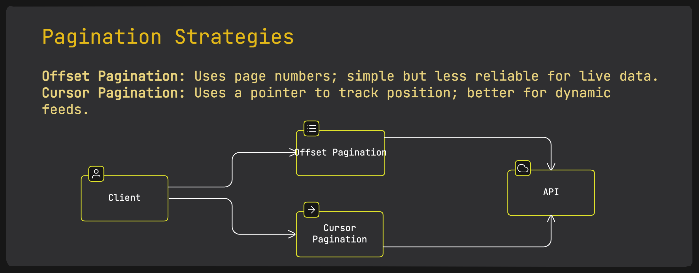 - Cursor pagination: ideal for infinite scroll feeds like social media timelines, notification lists, or any real-time list where items are frequently added or removed.