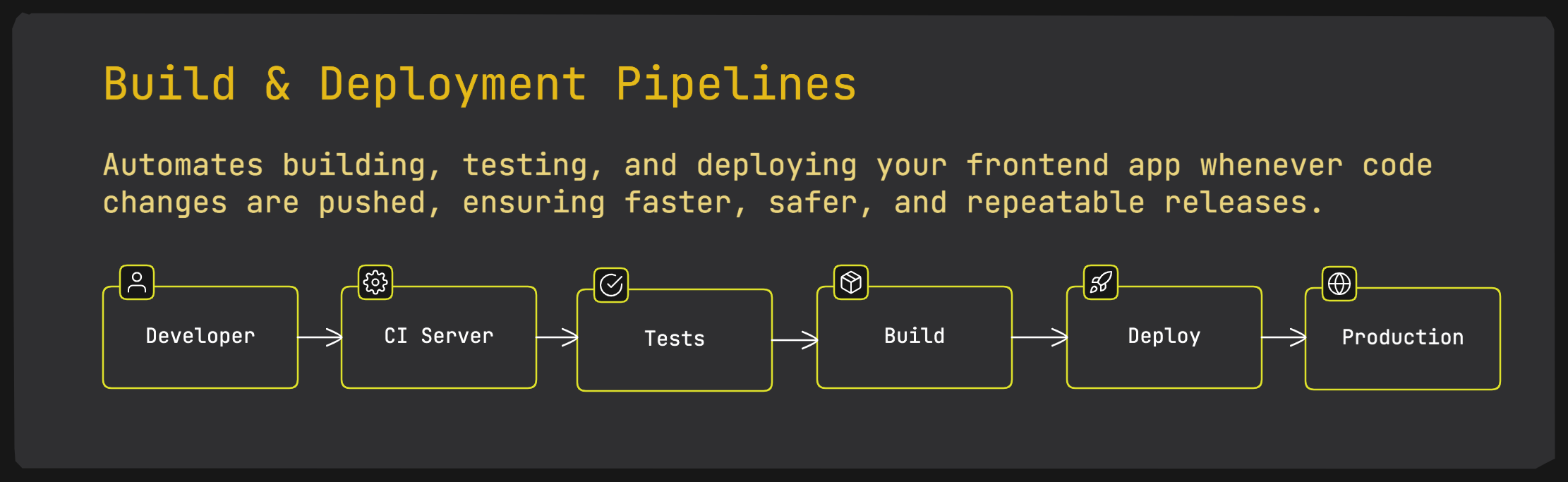 Frontend apps also benefit from CI/CD (Continuous Integration and Continuous Deployment) pipelines, just like backend services. These pipelines automatically handle steps like building the app, running tests, and deploying updates.