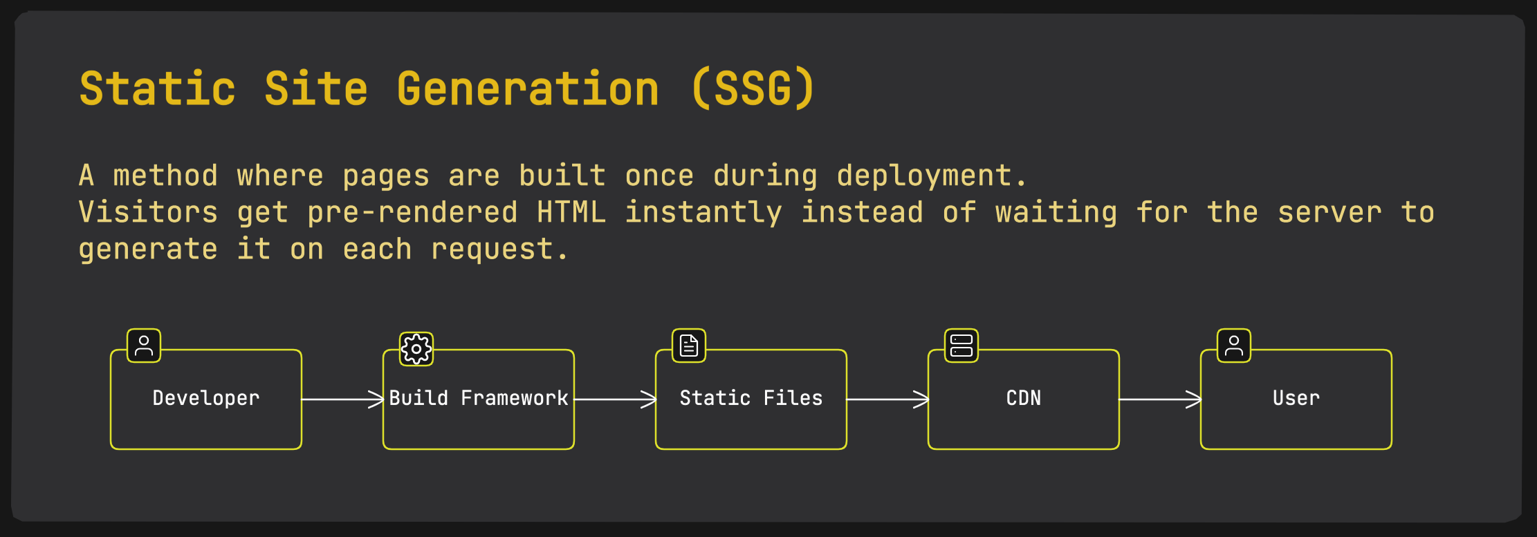 SSG solves this by pre-building the HTML when you deploy your site. The system can fetch data during the build process, even for pages with dynamic content, which means all content is baked into static HTML files before any user visits them.