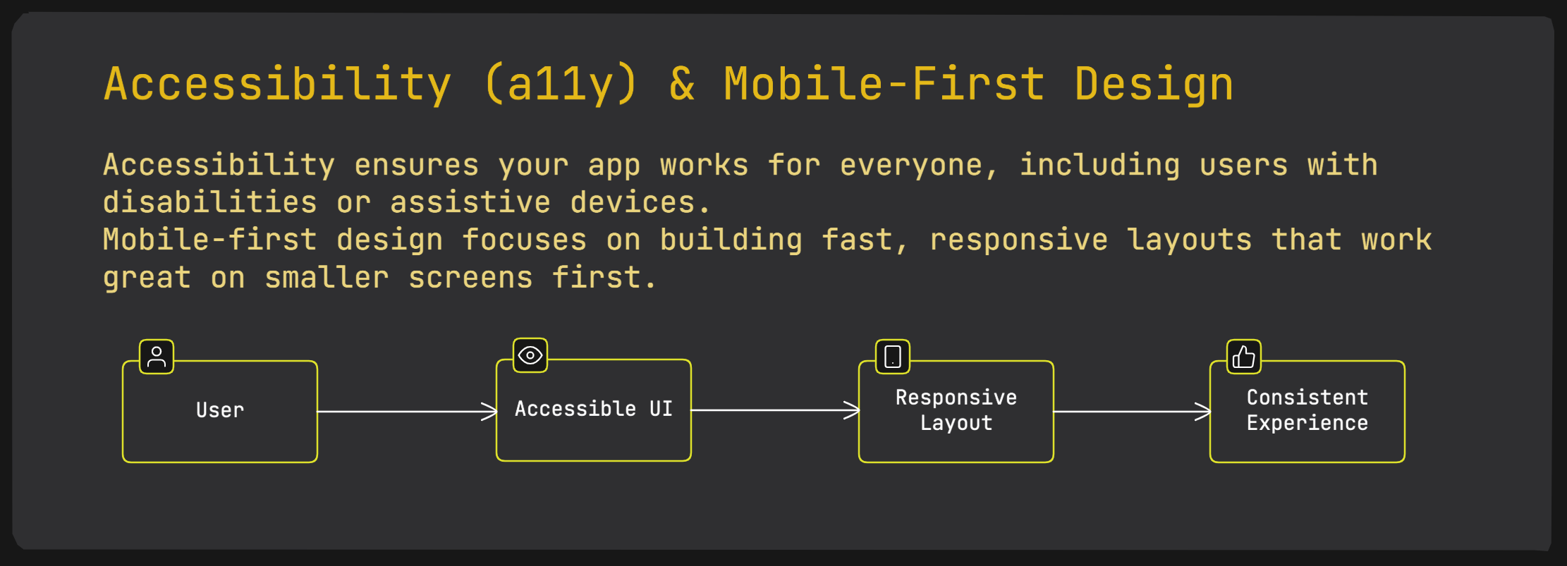 Accessibility and mobile-first design aren’t just design principles; they’re system-level considerations. Accessibility ensures your app’s UI and code structure work for everyone, including people using assistive technologies.