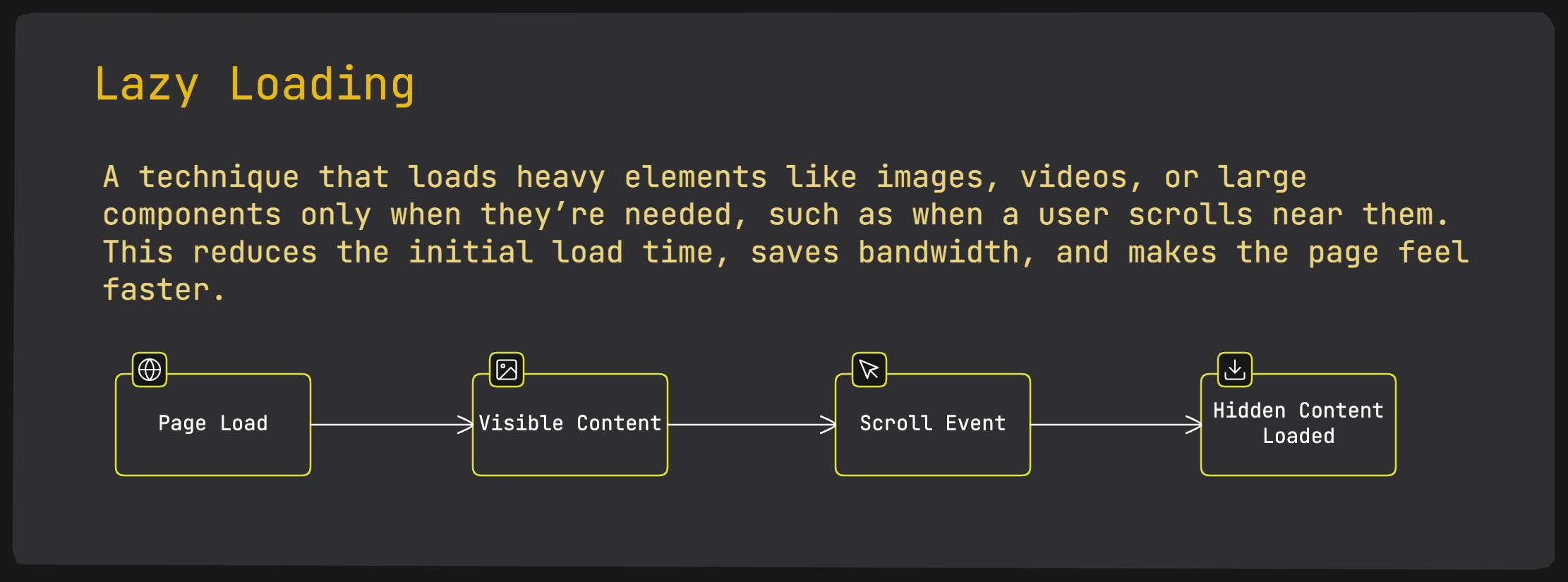 Not everything on a page needs to load immediately. Lazy loading means loading heavy assets, like images, videos, or big components, only when they’re actually needed.
