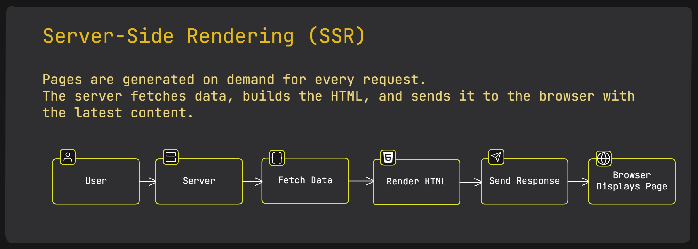 Unlike Static Site Generation (SSG), which is great for mostly static pages, SSR is useful when content needs to stay fresh or personalised. For example, dashboards, user profiles, or live feeds. Because the system generates pages in real time, they always display the latest data instead of relying on pre-built files.