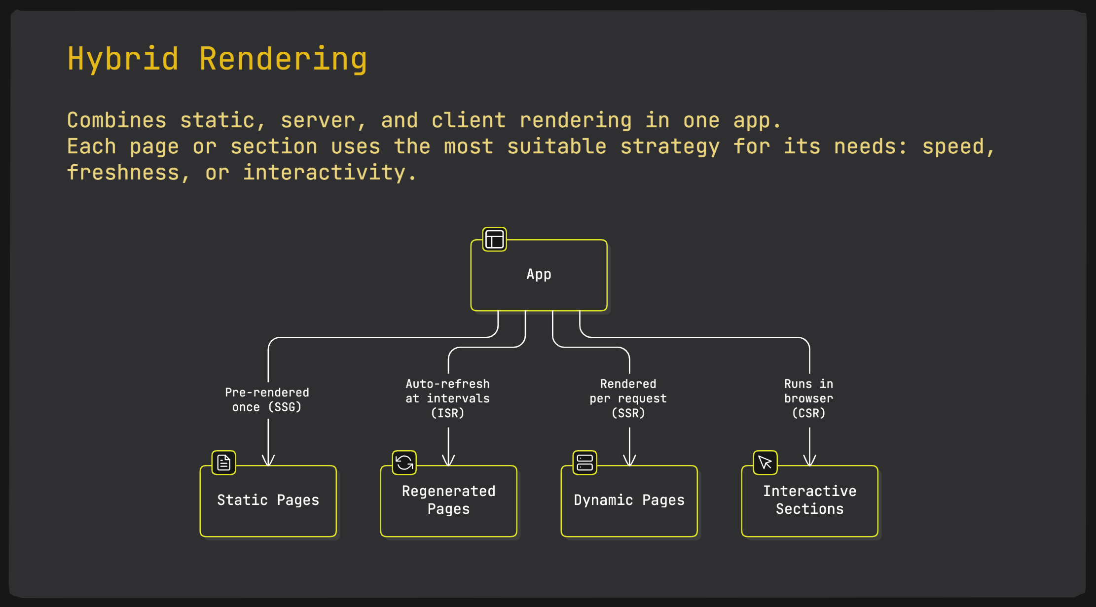 Different parts of your app might have different needs. For example, some pages stay mostly the same, while others need fresh or personalised data. That’s where hybrid rendering comes in.