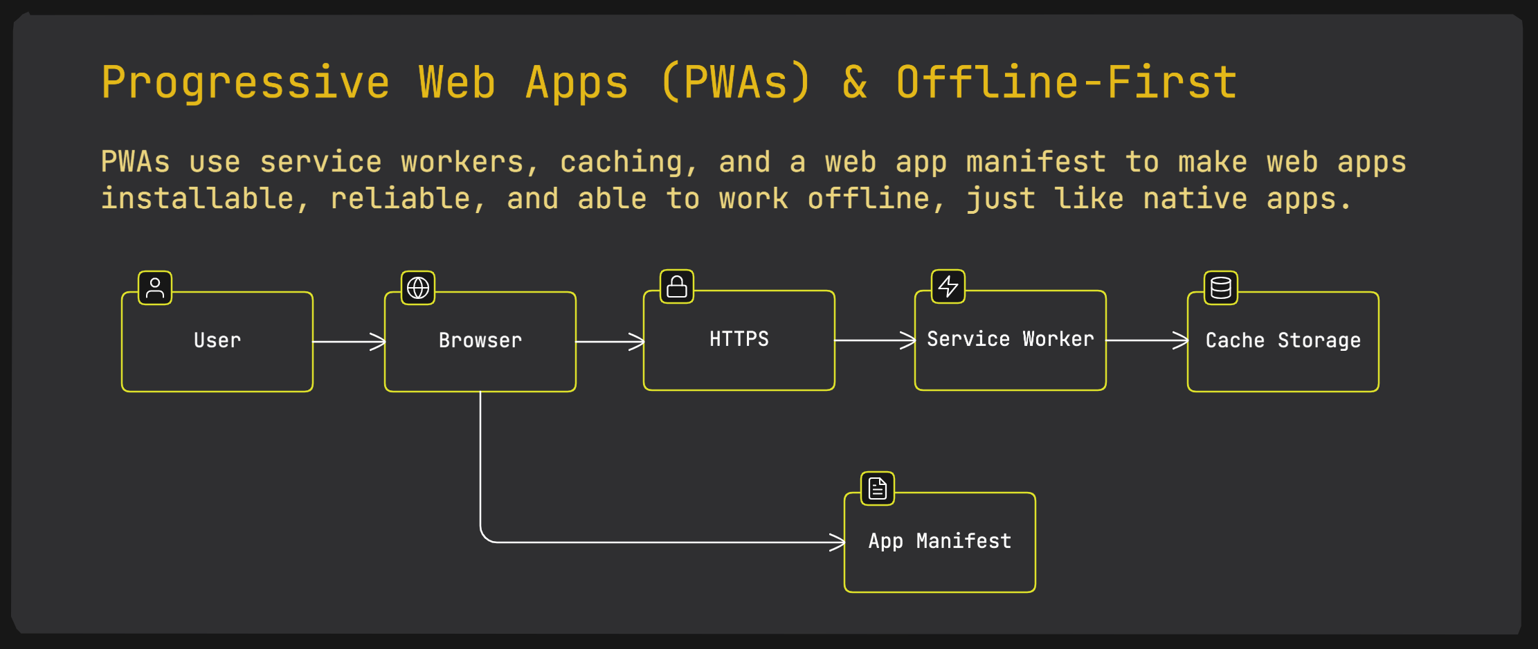 - Service workers run in the background to cache important files like HTML, CSS, and API responses.